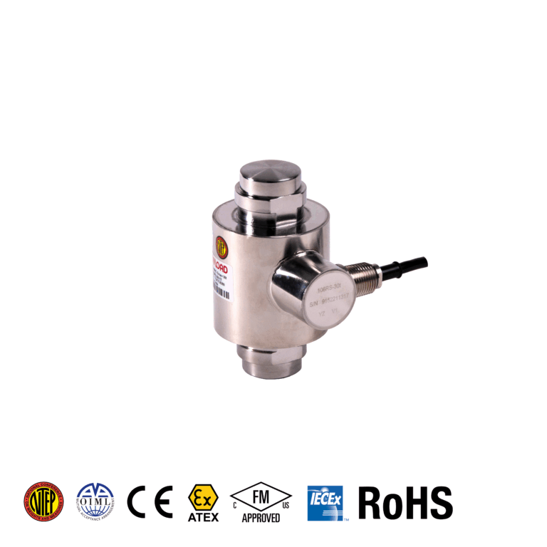 The document outlines available top cap and lower base options, designed for easier installation and improved versatility across various truck scale and heavy-duty compression weighing applications.