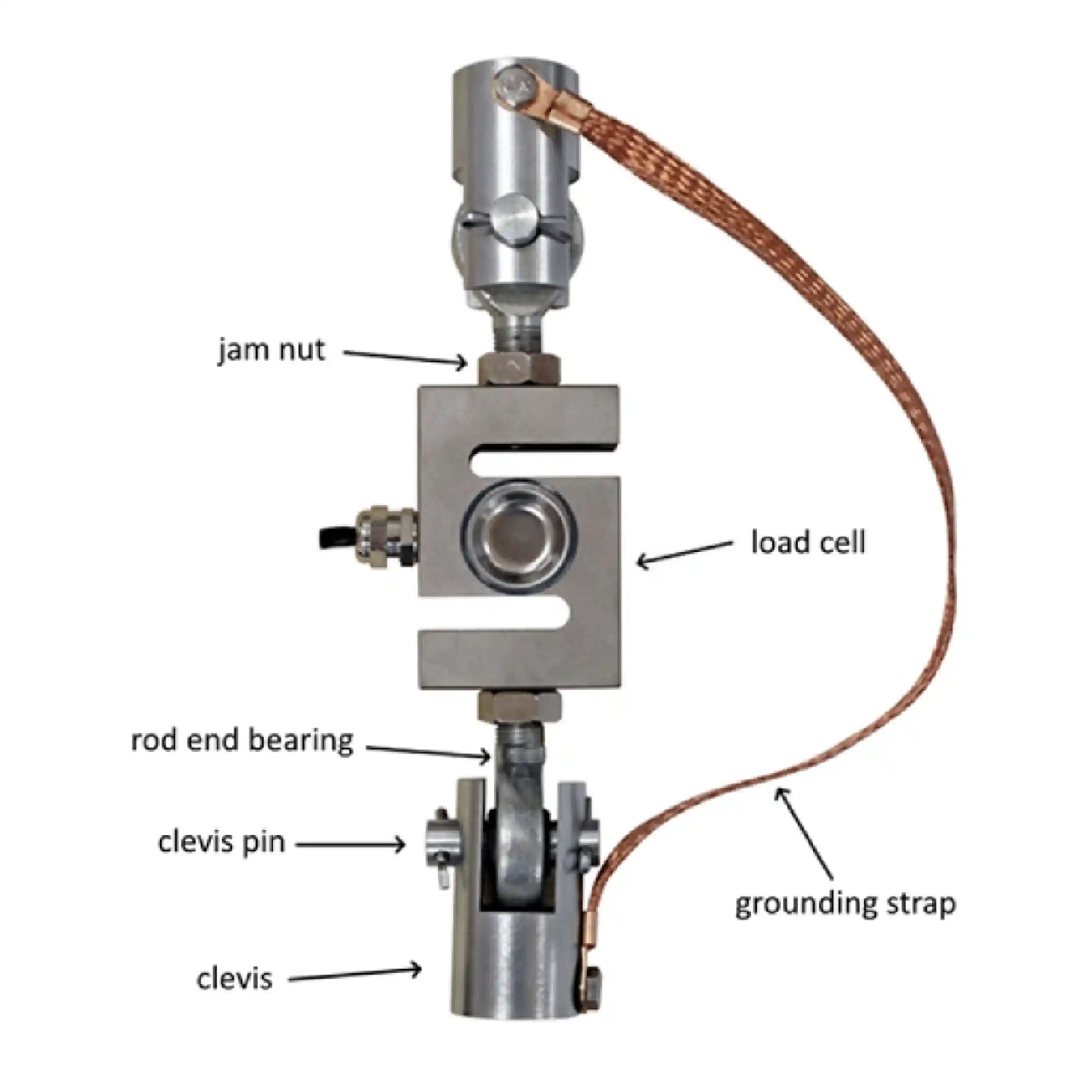 Tension weigh modules have more components than compression weigh modules as illustrated in Figure 8.1. The additional components are simply due to the nature of s-type load cell design with threaded fixtures to attach the load element, often incorporating spherical rod end bearings or a ball-and-cup style mounting.