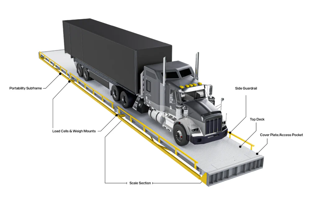 The vast majority of truck scales are full-length truck scales. They are designed to weigh a vehicle (including tractor and trailer) in a single pass. These scales typically range from 60 to 120 feet in length and are used in high-throughput operations such as freight terminals, batching plants, and agricultural receiving sites. They are often installed on permanent foundations (pit, slab, or pier) and are certified for legal-for-trade use. Full-length scales provide total gross weight and, when paired with software or indicators, can calculate net and tare values as well.