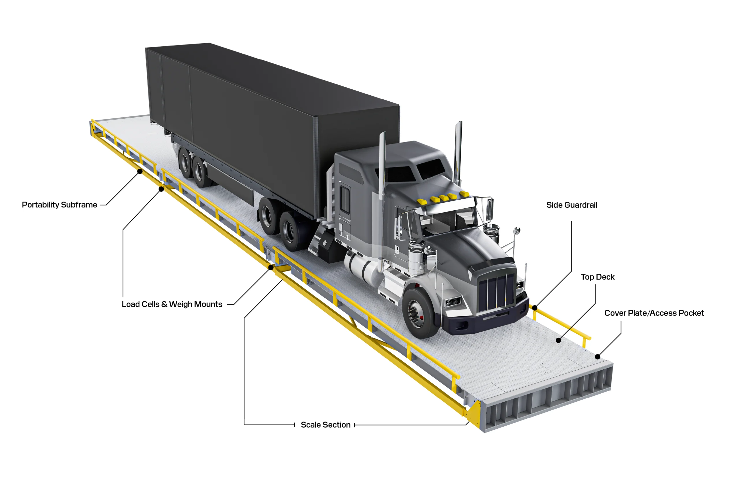 Portable truck scales are modular systems designed for temporary or mobile installations. Mounted on steel subframes which serve as a mobile foundation for the weighbridge, these steel deck scales are ideal for construction projects, seasonal agricultural operations, or remote job sites as they’re designed for rapid deployment and disassembly. Portable scales maintain high accuracy comparable to a permanent scale and can be certified for legal-for-trade use, provided the foundation and levelling are properly managed. They offer flexibility without compromising performance.